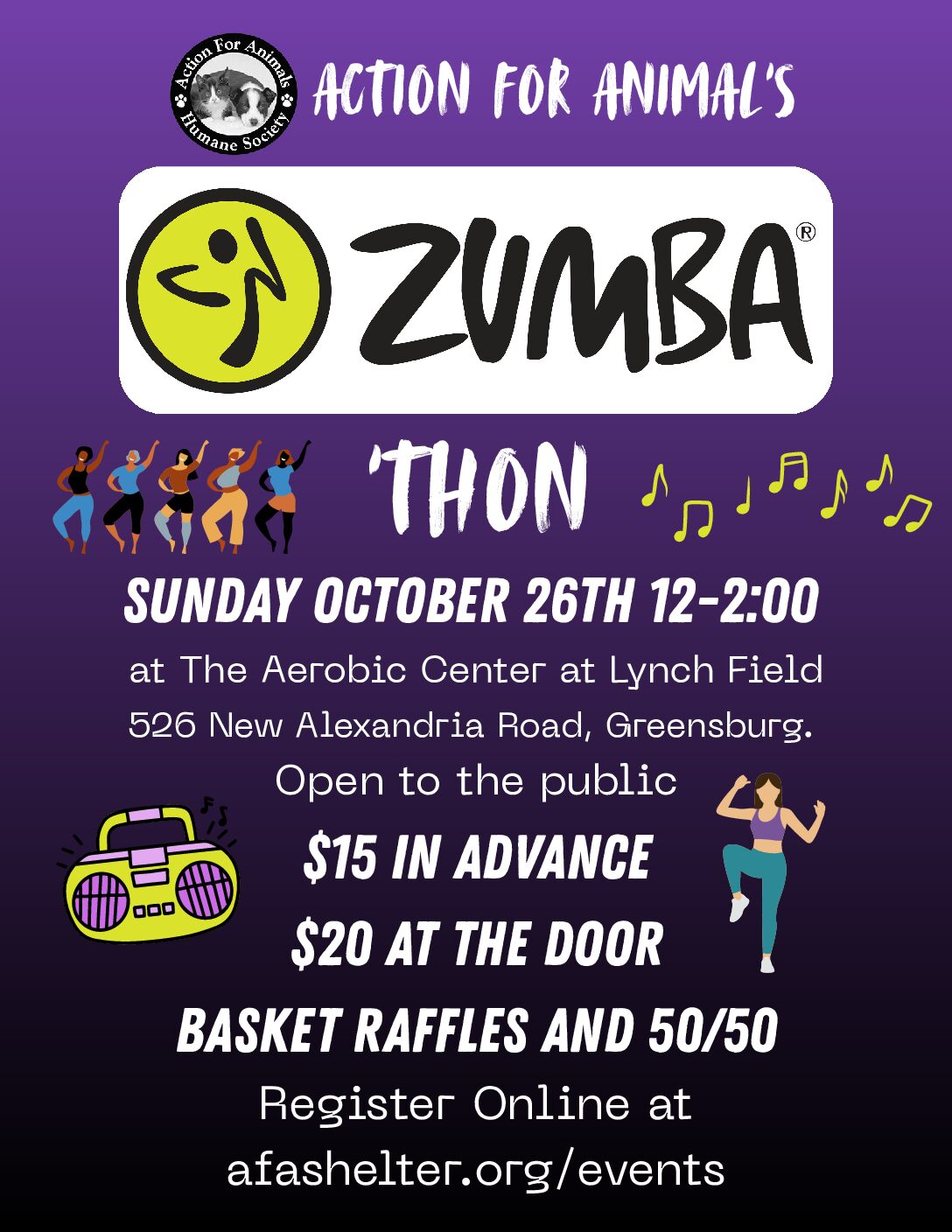 Join us for AFA’s 2nd Annual ZUMBAthon on Sunday, October 26, from 12:00 to 2:00 p.m at The Aerobic Center at Lynch Field, 526 New Alexandria Road in Greensburg.